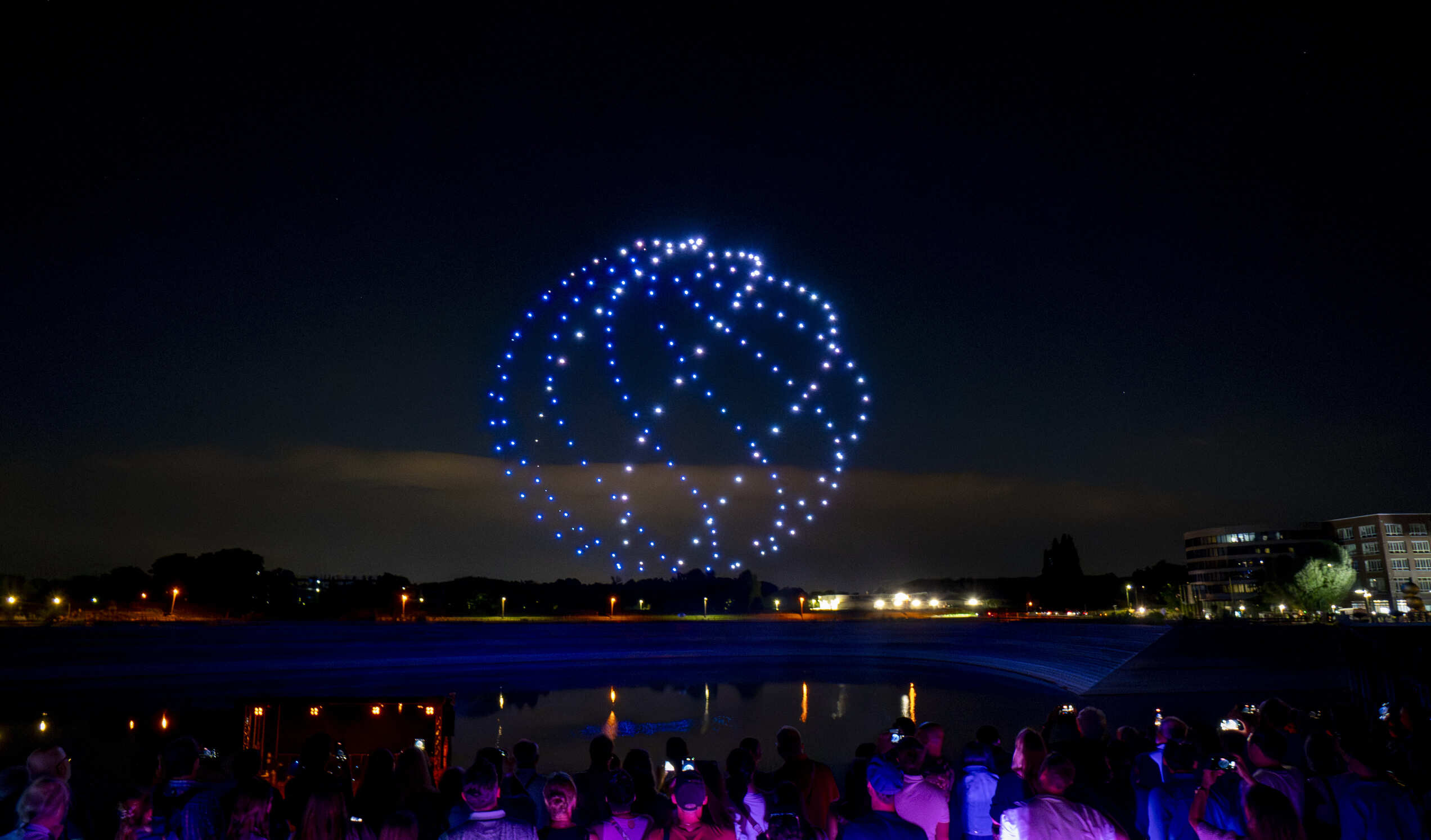 Unsere Drohnenflotte war synchron zu Musik und Lichtdesign programmiert, sodass die Motive fließend ineinander übergingen. Die Lichtreflexionen auf dem Wasser konnten das Gesamtbild zusätzlich verstärken.